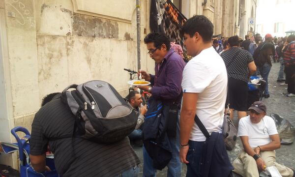 Ore 14.55 – La piazza rifiuta la divisione in “buoni e cattivi”. Dopo gli ultimi dati su disoccupazione e povertà c'è molta unione e si richiede a gran voce la liberazione dei manifestanti fermati dalla polizia. Intanto, sui social network, si ironizza con quanto scritto da alcuni giornali a proposito di un ”assalto con le uova a un blindato della polizia”. Il clima tra i manifestanti è molto buono, c'è determinazione e si vuole continuare la lotta per il diritto alla casa. Montecitorio è gremita di persone: come il 19 ottobre in piazza anche i migranti. E c'è chi ne approfitta per un pranzo al sacco (foto di Matteo Parlato).